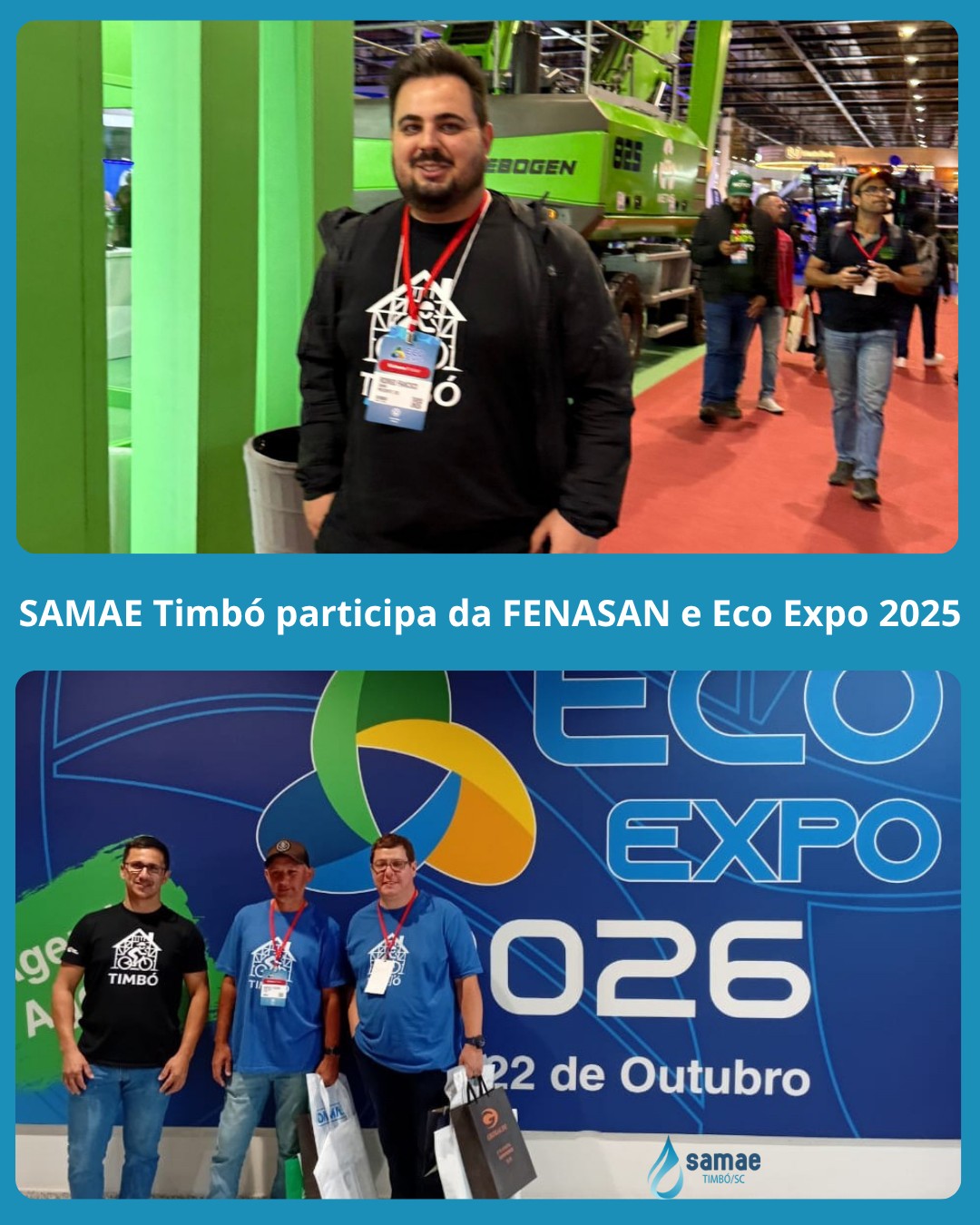 Nos dias 21 e 23 de outubro, a equipe do Samae de Timbó marcou presença em dois dos maiores eventos do setor de saneamento e sustentabilidade do país: a FENASAN 2025 e a Eco Expo 2025, realizados em São Paulo. Representaram o Samae os colaboradores Evandro dos Santos, Vanderlei Gessner, Rafael D’Ávila e o diretor-presidente Rodrigo Francisco, que acompanharam as novidades tecnológicas, soluções ambientais e boas práticas voltadas à gestão eficiente da água e do saneamento. A participação do Samae nesses eventos reforça o compromisso da autarquia com a inovação, a sustentabilidade e a melhoria contínua dos serviços públicos, garantindo à população de Timbó um atendimento cada vez mais moderno e responsável. O Samae segue buscando conhecimento e parcerias que contribuam para o desenvolvimento sustentável de Timbó e para a preservação dos recursos hídricos.